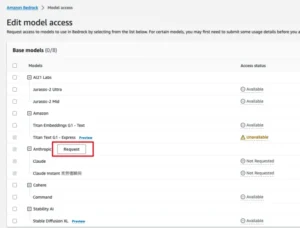 点击右侧的“Manage model access”,再点击 Anthropic 的 Request,提交公司信息。